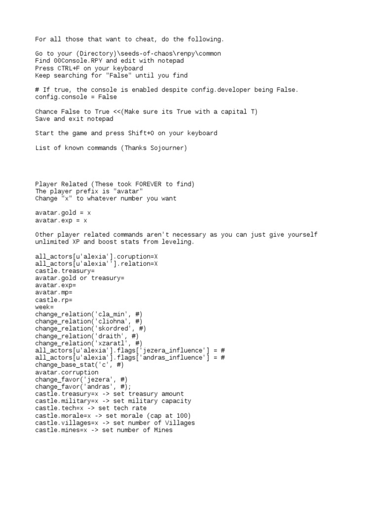 Seeds of Chaos Cheats Enable Console. Rowan Helayna 1. Go to your Directoryseeds-of-chaosrenpycommon Find 00ConsoleRPY and edit with notepad Press CTRLF on your keyboard Keep searching for False until you find If true the console.